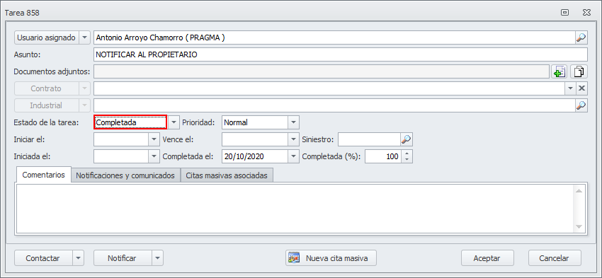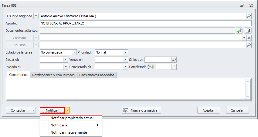 Para notificar la finalización de contrato al arrendador, abra la tarea Notificar al propietario. Haga clic en el botón Notificar y escoja Notificar propietario actual.