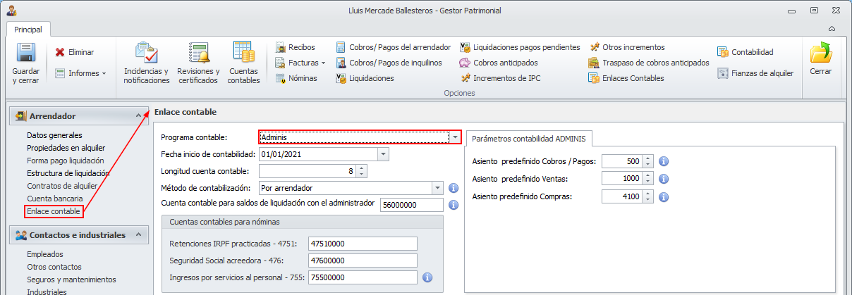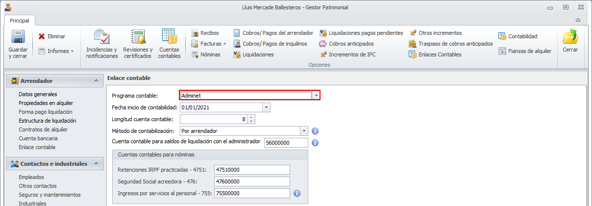 Para cambiar la configuración del enlace contable de un gestor patrimonial hacia la contabilidad de Adminet, vaya a su ficha y sitúese en la sección Enlace contable.