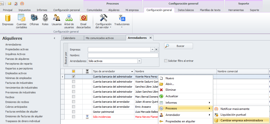 Para cambiar la empresa administradora de un arrendador, haga clic derecho sobre dicho arrendador y escoja Procesos y Cambiar empresa administradora.
