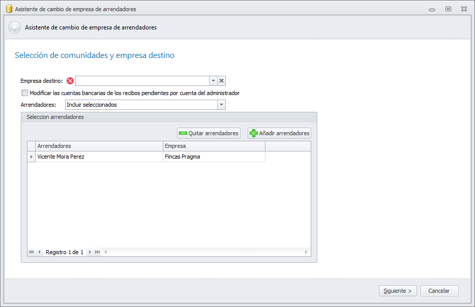 Empresa destino. Escoja la empresa a la que se va a transferir la gestión del arrendador.