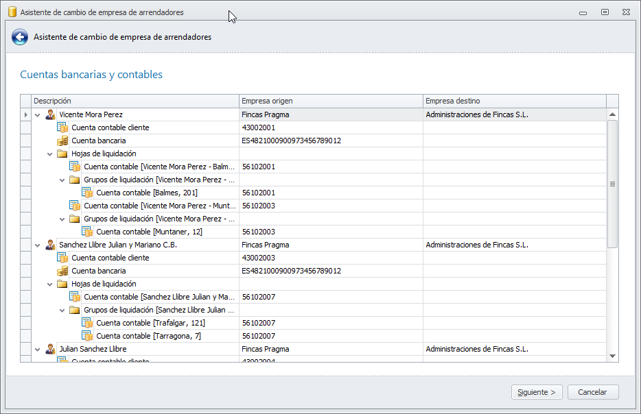 Al hacer clic en Siguiente se analiza el detalle de los arrendadores a traspasar (hojas y grupos de liquidación y perceptores de reparto) y si la empresa de destino tiene enlace contable. Se solicita por pantalla la cuenta contable y la cuenta bancaria a asignar para cada uno de los elementos, en una lista como la siguiente. Si la empresa de destino no tiene enlace contable y no hay cuentas bancarias a informar, esta ventana no se muestra.