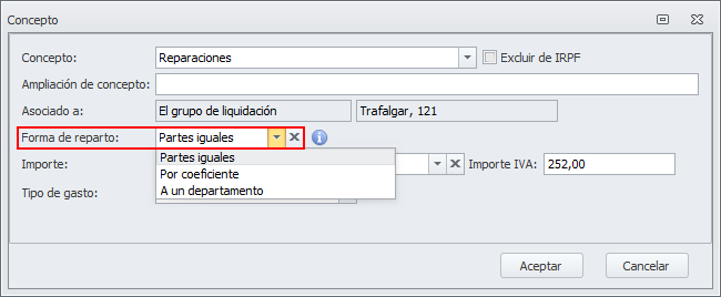 Cuando se registra un gasto vinculado a un grupo de liquidación, se permite indicar su forma de reparto.