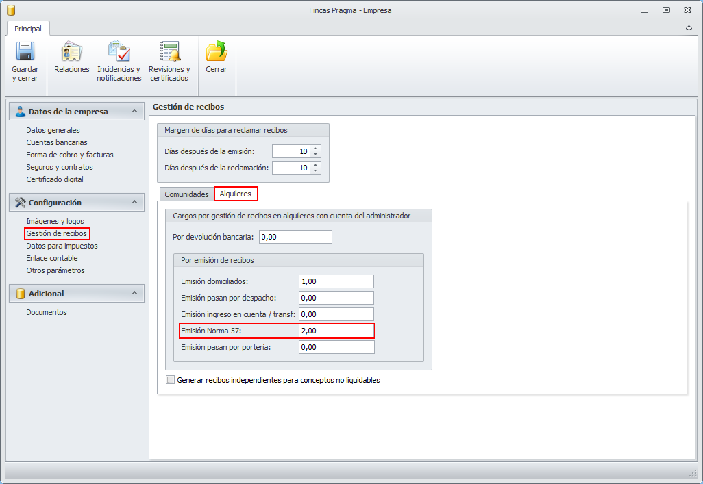 Para los recibos que sean emitidos por cuenta bancaria del administrador, el administrador puede, opcionalmente, añadir al recibo comisiones por gastos de emisión. Estos gastos de emisión se deben especificar en la sección Gestión de recibos de la ficha de Empresa.