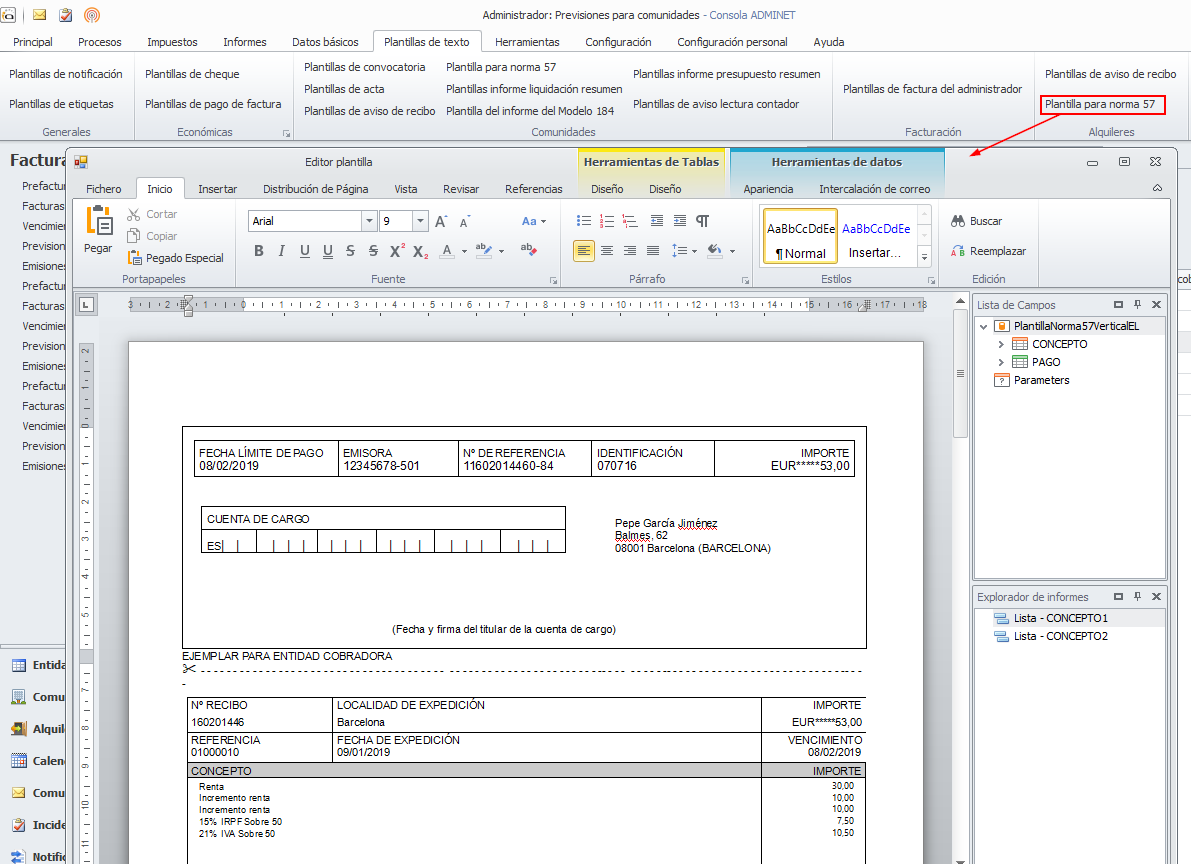 Si desea personalizar o modificar la plantilla de la carta de pago puede hacerlo accediendo al menú Plantillas de texto y escogiendo la opción Plantilla de norma 57 del apartado Alquileres.