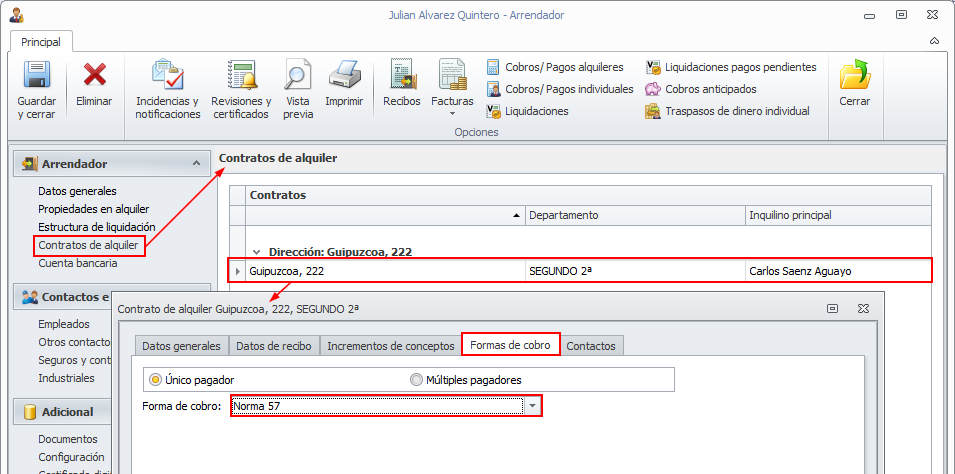 Los inquilinos a los que se desee enviar la carta de pago deben tener seleccionada, en su contrato de alquiler, la forma de cobro Norma 57, como se puede ver en la siguiente imagen.