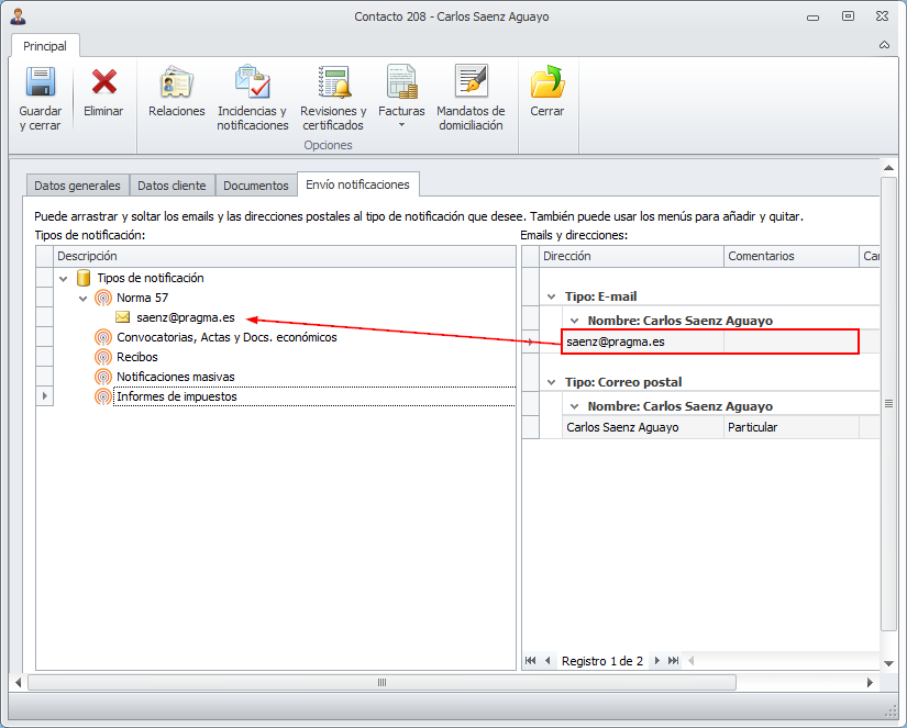 En la ficha del contacto correspondiente al inquilino, se puede prefijar una forma de envío específica por cada tipo de notificación. Si desea que a un inquilino concreto se le remita la notificación por una forma de envío concreta, especifíquelo. Para especificar la forma de envío de la Norma 57, debemos arrastrar desde Emails y direcciones el mail o dirección postal hacia el nodo Norma 57. Esto predeterminará a este contacto con esta forma de envío para Norma 57.