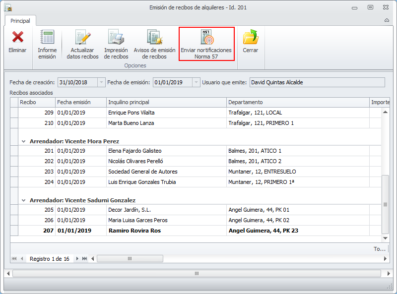 El envío de los documentos de Norma 57 se realiza desde la ficha de la emisión de recibos específicamente desde el botón Enviar notificaciones Norma 57.