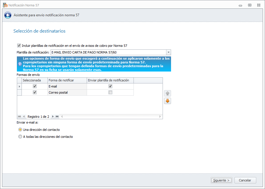 Al preparar el envío, para cada propietario, adminet analizará si tiene en su ficha de contacto una forma de notificación predeterminada para la Norma 57. Si la tiene, usará esa forma de envío. Si no, utilizará la especificada en el asistente.