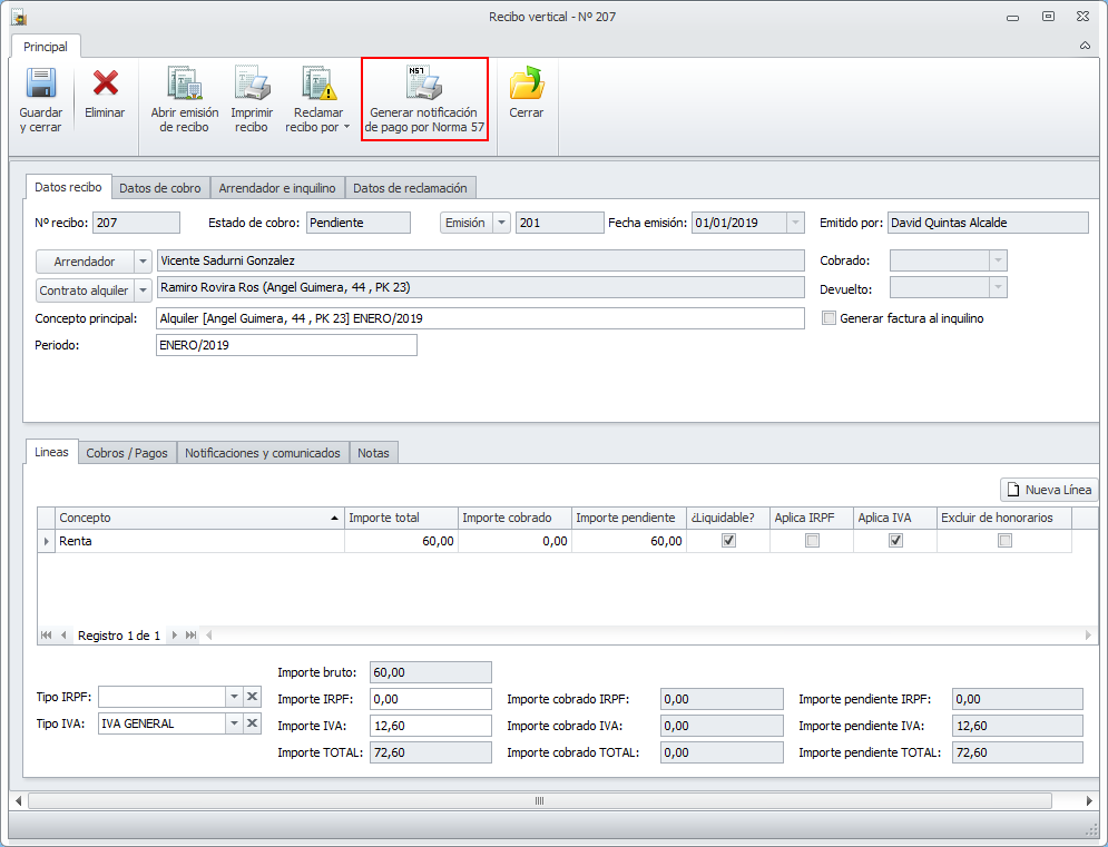 Desde un recibo pendiente o devuelto, independientemente de su forma de cobro, también puede imprimir el documento de pago, usando el botón Generar notificación de pago por Norma 57. De este modo puede emitir este documento de pago para cualquier inquilino que tenga recibos pendientes, redirigiéndolo a la entidad bancaria correspondiente.