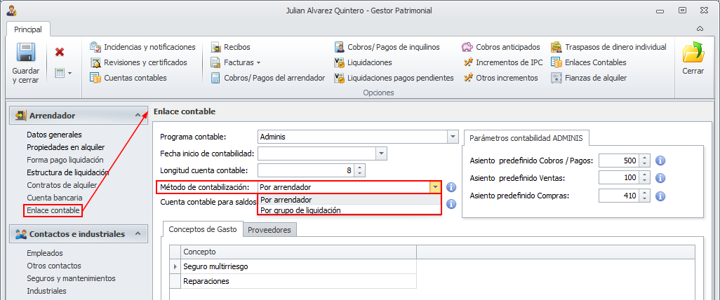 En la sección Enlace contable del arrendador, se indica el método de contabilización de las ventas.