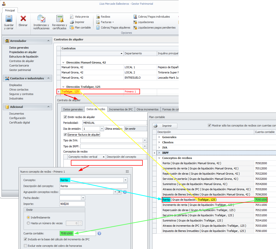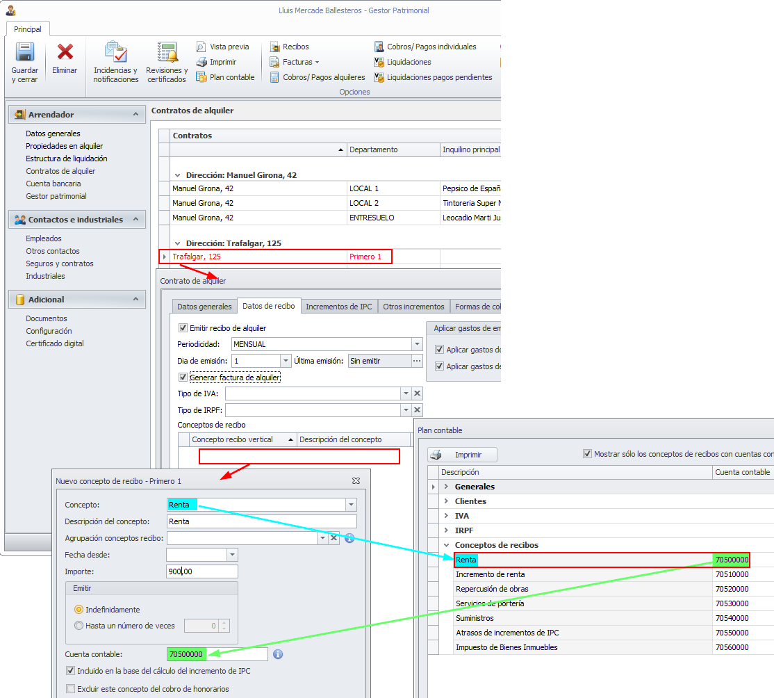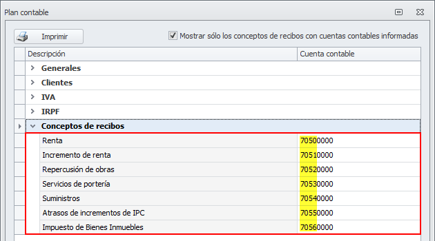 Si el método de contabilización es por arrendador se mostrará la cuenta asociada al concepto de recibo.