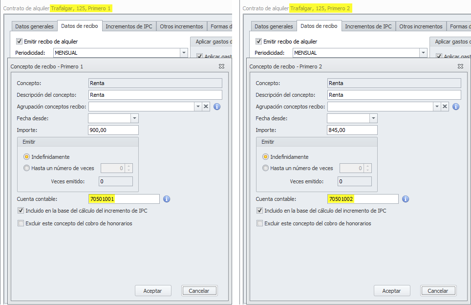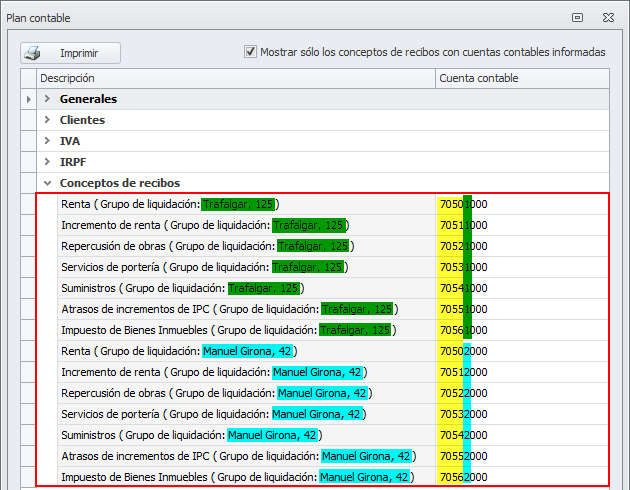 En la imagen anterior se ve como todos los conceptos de recibo se repiten para dos grupos de liquidación: Trafalgar, 125 y Manuel Girona, 42. Vemos también como los 4 primeros dígitos diferencian el concepto del recibo y el quinto determina el grupo de liquidación (1 - Trafalgar, 125 y 2 - Manuel Girona, 42).