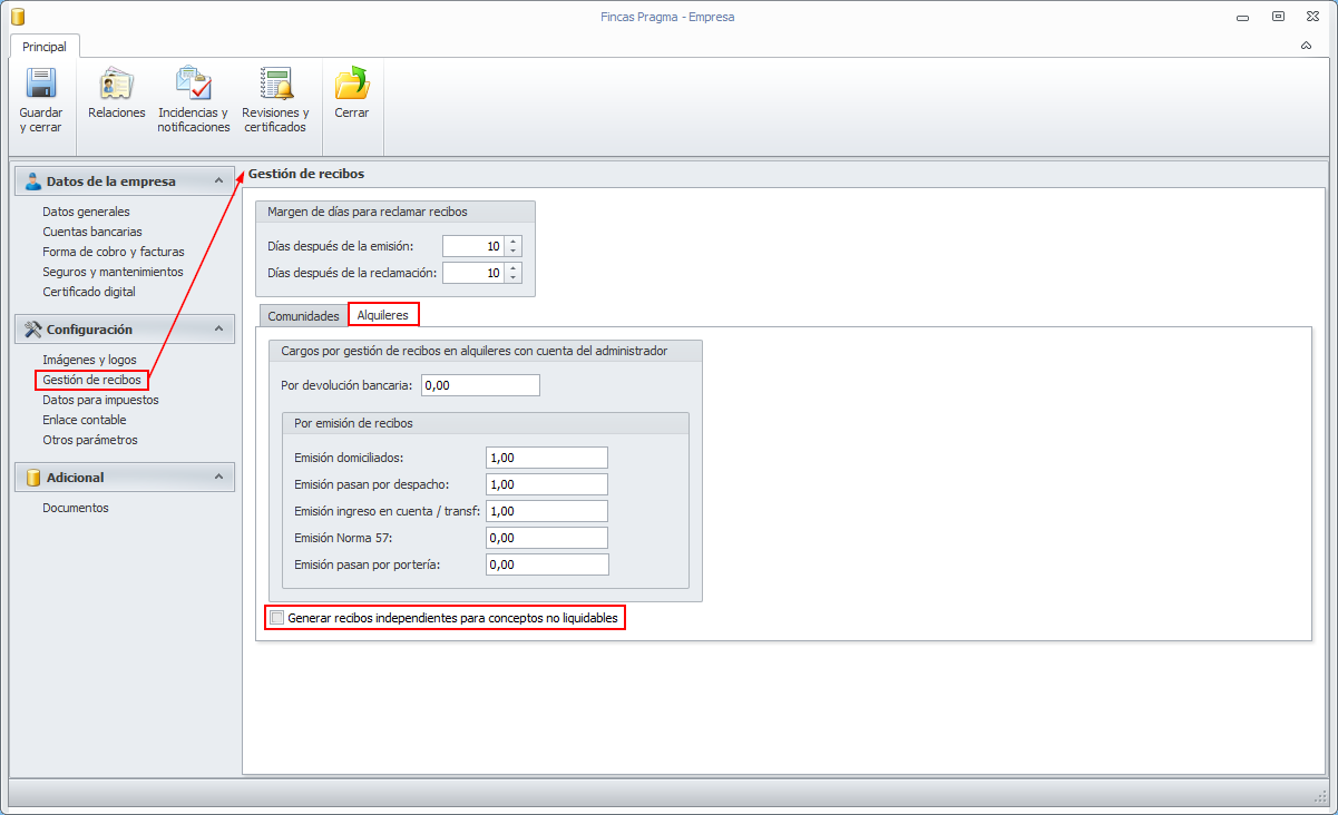 En la ficha de Empresa del menú Configuración, puede configurar si desea Generar recibos independientes para conceptos no liquidables.