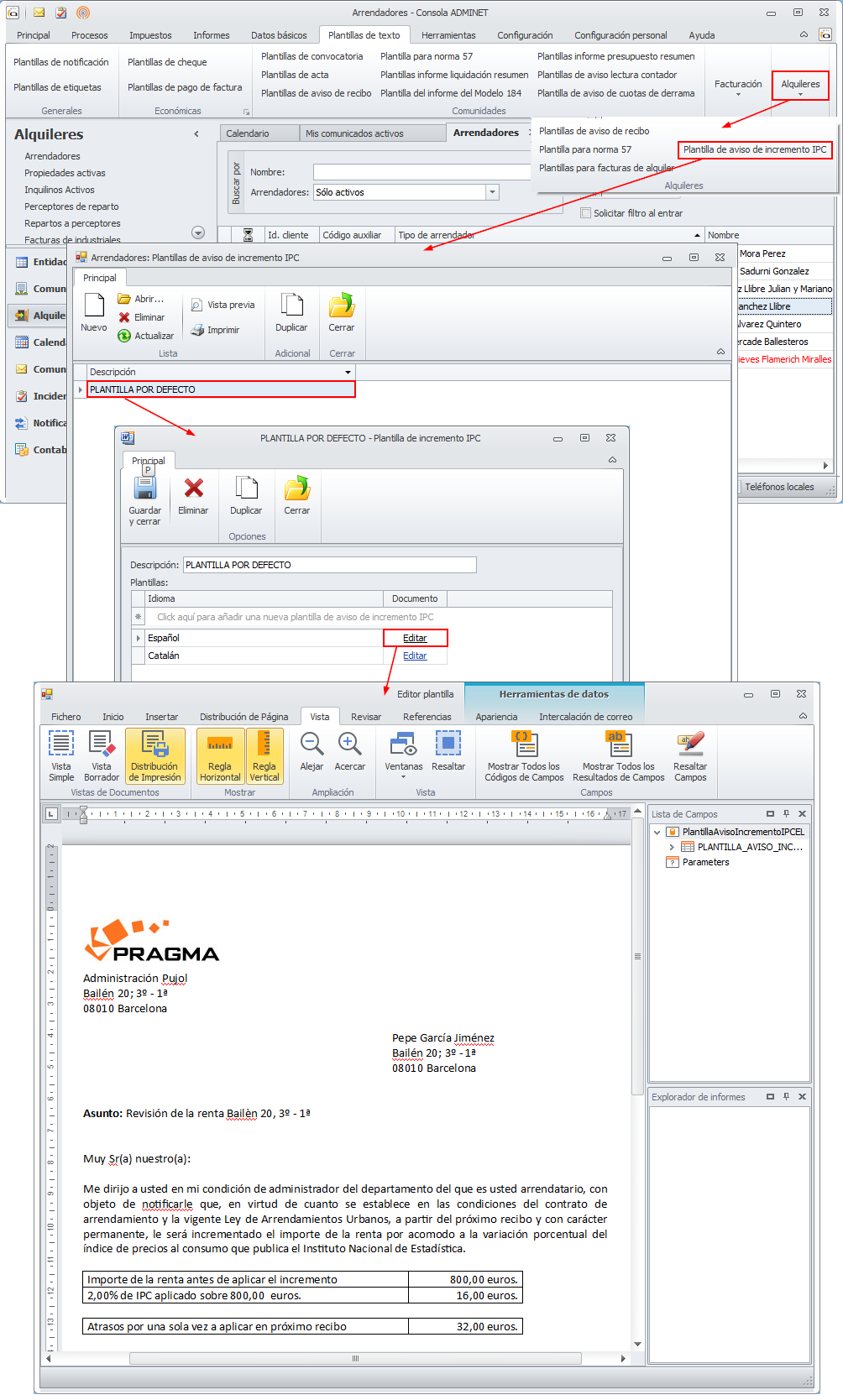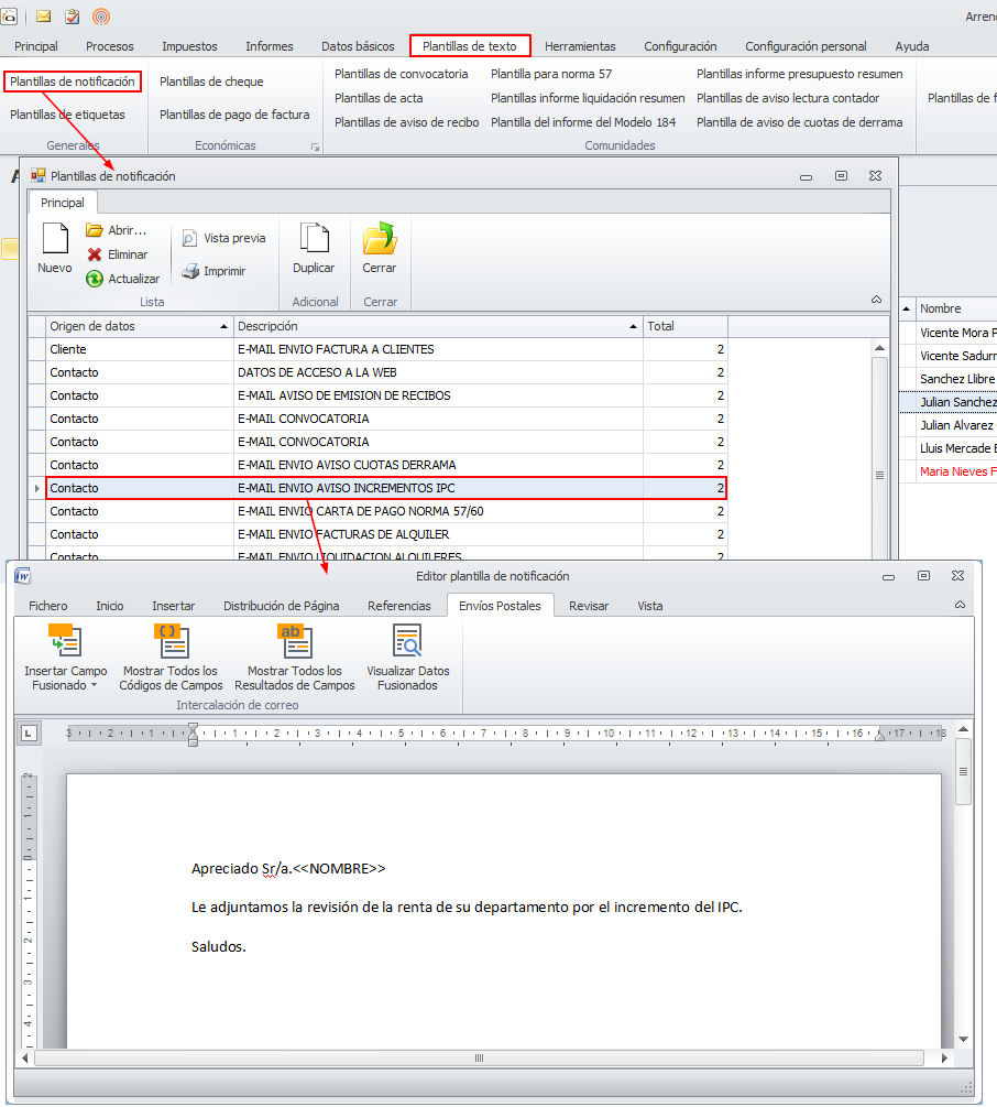 Vaya al menú Plantillas de texto. En el grupo Alquileres encontrará la opción Aviso de incremento IPC donde se encuentra la plantilla que se usará para notificar los incrementos de renta por IPC.