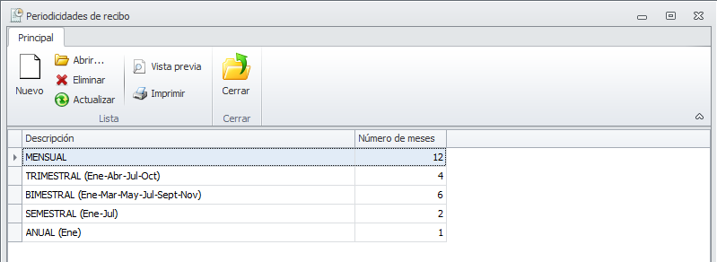 En esta tabla se relacionan las periodicidades con las que se emiten los recibos. En el caso de los alquileres, salvo raras excepciones, la periodicidad es mensual. Esta periodicidad ya viene por defecto con el programa. Si tiene algún caso especial y echa en falta alguna periodicidad la puede añadir.