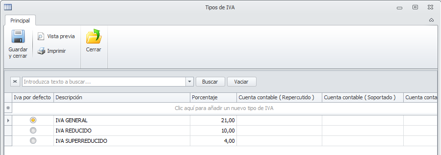 Los tipos de IVA usados en los recibos de alquiler son los mismos que se reflejan en el IVA general, reducido y superreducido. Si en alguna ocasión, a causa de cambios legislativos, hace falta añadir algún tipo de IVA puede hacerlo en esta tabla.