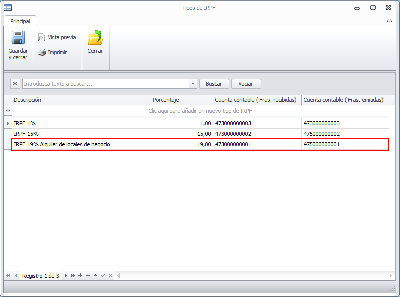 El IRPF que se aplica en los arrendamientos de locales de negocio es, actualmente, el 19%. Si en su lista de tipos de IRPF no lo encuentra, añádalo. Si tiene activo el enlace contable deberá cuentas contables para este tipo de IRPF, aunque en realidad el IRPF de los locales de alquiler no generan ningún movimiento en la contabilidad del administrador.
