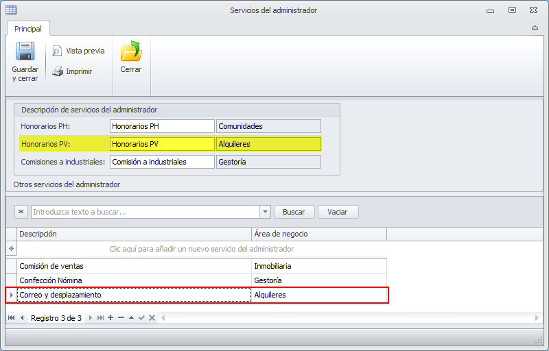 Además, en esta lista debe añadir los demás conceptos por los que quiera cargar otros honorarios en las facturas de honorarios a arrendadores. Cuando lo haga, tenga presente asociar estos servicios al área de negocio Alquileres. En el ejemplo anterior puede ver como se ha añadido el concepto Correo y desplazamiento.