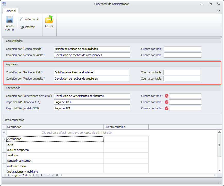 Se trata de los conceptos que se van a incluir en el conjunto de recibos de alquiler.