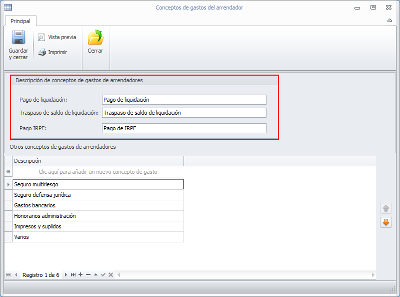 A continuación, en la lista inferior, añada todos los textos de gastos por los que va a realizar ingresos y gastos por cuenta de sus arrendadores. No se incluyen los cobros y devoluciones de recibo.