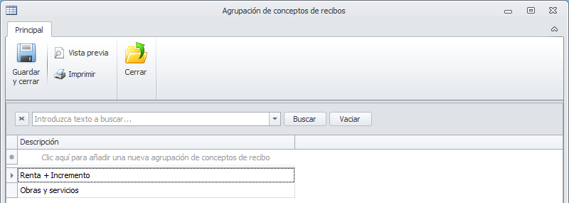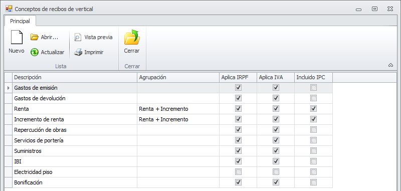 En esta tabla se pueden relacionar textos para agrupar bajo ellos y sumados varios conceptos de recibo. Un ejemplo claro es el de Renta + Incremento. Permite tener desglosado en la ficha del inquilino el importe de la renta base por un lado y los incrementos de IPC por otro. Asignando a cada uno de esos conceptos este concepto de agrupación se facilita que al imprimir el recibo o la factura de alquiler, se agrupen y sumen ambos conceptos bajo el título Renta + Incremento.