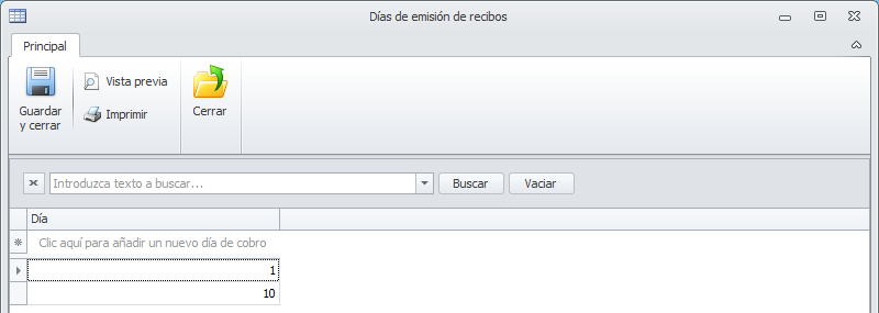 Si va a querer preparar domiciliaciones bancarias para diferentes días, debe añadir esos días en esta tabla, como días de emisión. En estos momentos, para poder generar domiciliaciones en diferentes fechas, deben prepararse diferentes emisiones.
