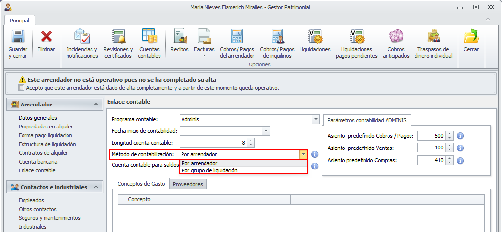 Acceda a la sección Enlace contable de la ficha del arrendador. Debe indicar el Método de contabilización.