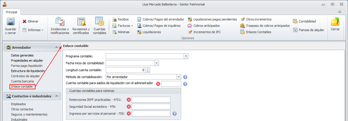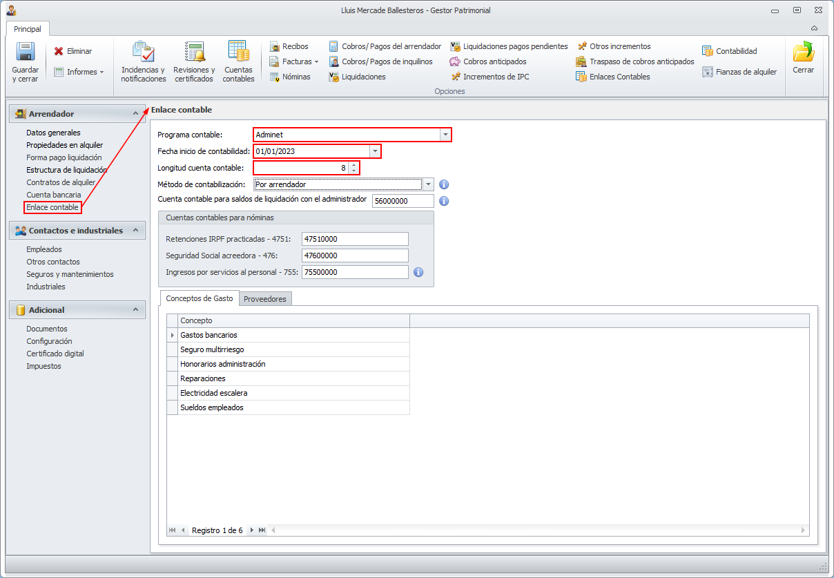 Configurar enlace contable de un gestor patrimonial hacia Adminet