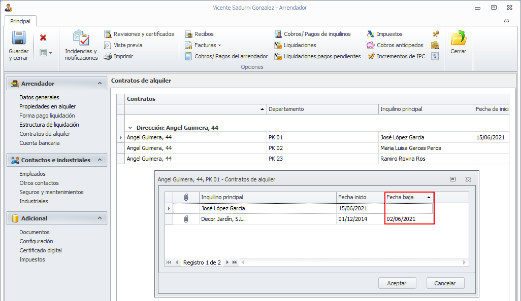 Se abre una ventana que muestra el histórico de contratos de ese departamento y en el que puede ver el nombre del inquilino principal, y las fechas de alta y baja. Evidentemente, el contrato que se encuentre activo se mostrará sin fecha de baja.