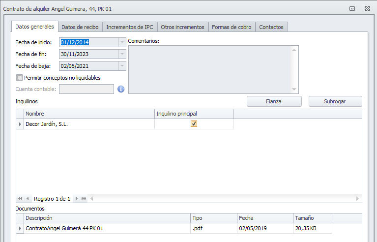 Haga doble clic en el contrato que desee consultar. Se abrirá la ficha del contrato en modo consulta. No se permitirá cambiar ningún dato.