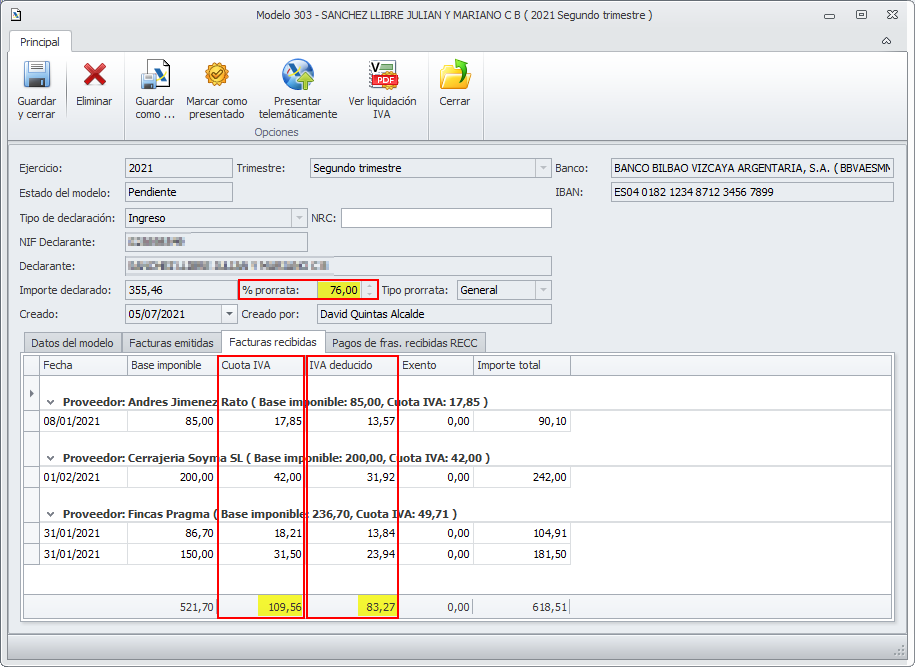 Existe una diferencia en la cuenta de IVA soportado entre el IVA de las facturas (soportado) y el que se incluye en el modelo (deducido según prorrata). Esto únicamente ocurre cuando la prorrata no es del 100%.