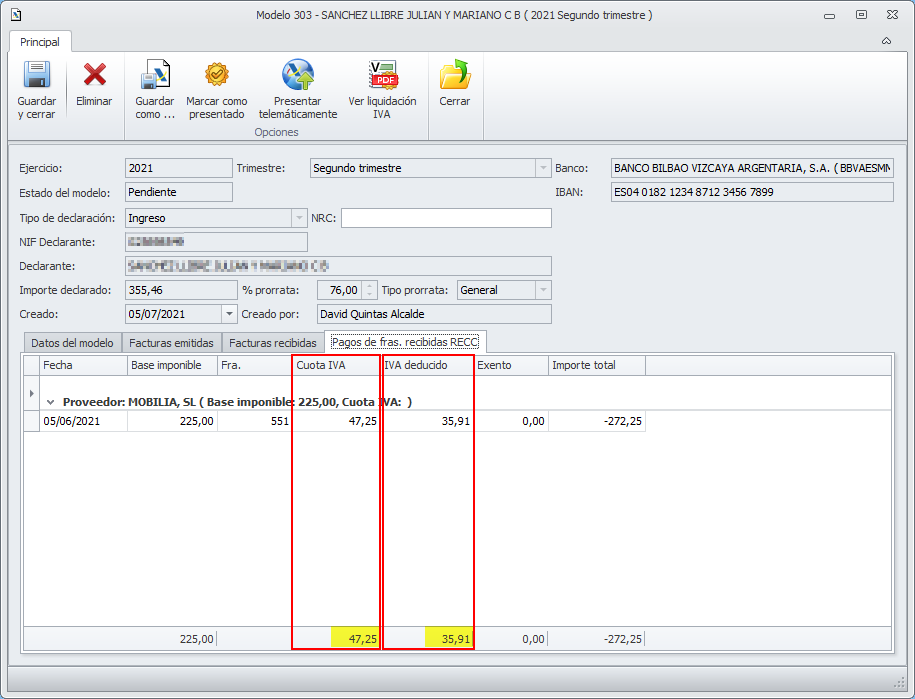 Si el modelo incluye facturas recibidas adscritas al régimen especial de criterio de caja (RECC), también se suman al apunte de la cuenta 472 por el importe total deducido.