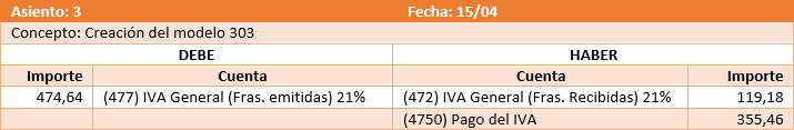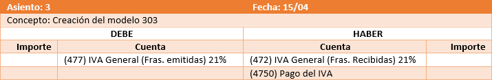 El modelo 303 contabiliza un asiento que traslada a la cuenta informada en el concepto del administrador Pago del IVA el saldo de los IVA's repercutidos y soportados incluidos en el modelo.