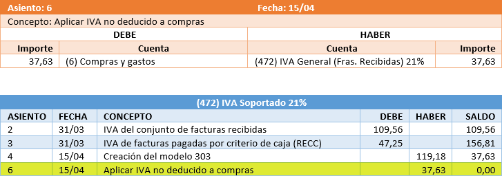 Contablemente, este IVA que no se ha podido deducir, debe considerarse como gasto. Se deberá realizar un asiento manual en su contabilidad que traspase el IVA no deducido (en el ejemplo 37,63 €) de la cuenta de IVA soportado a la cuenta o cuentas de gastos que el contable decida. La siguiente imagen muestra este asiento y como queda reflejado en el extracto de la cuenta de IVA soportado.