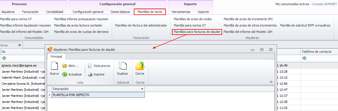 Para crear la plantilla, vaya al menú Plantillas de texto y haga clic en la opción Plantillas de facturas de alquiler que encontrará en el grupo Alquileres.