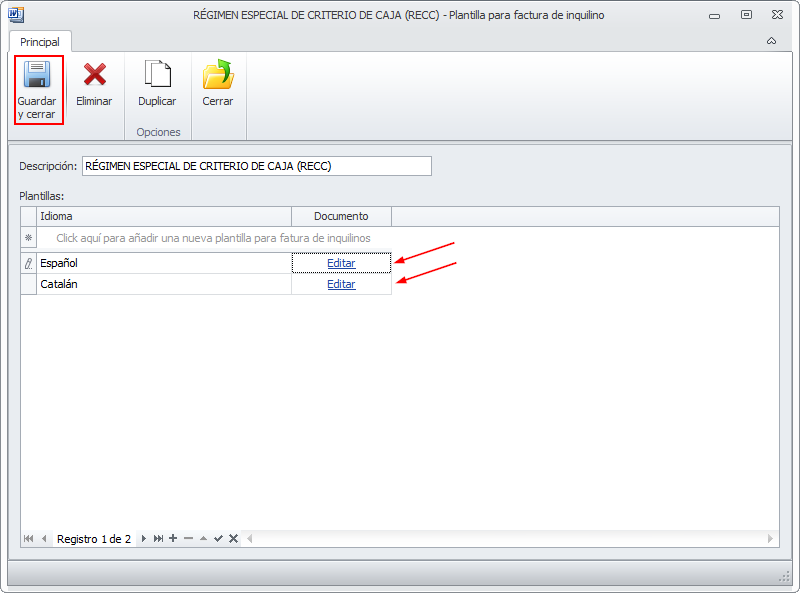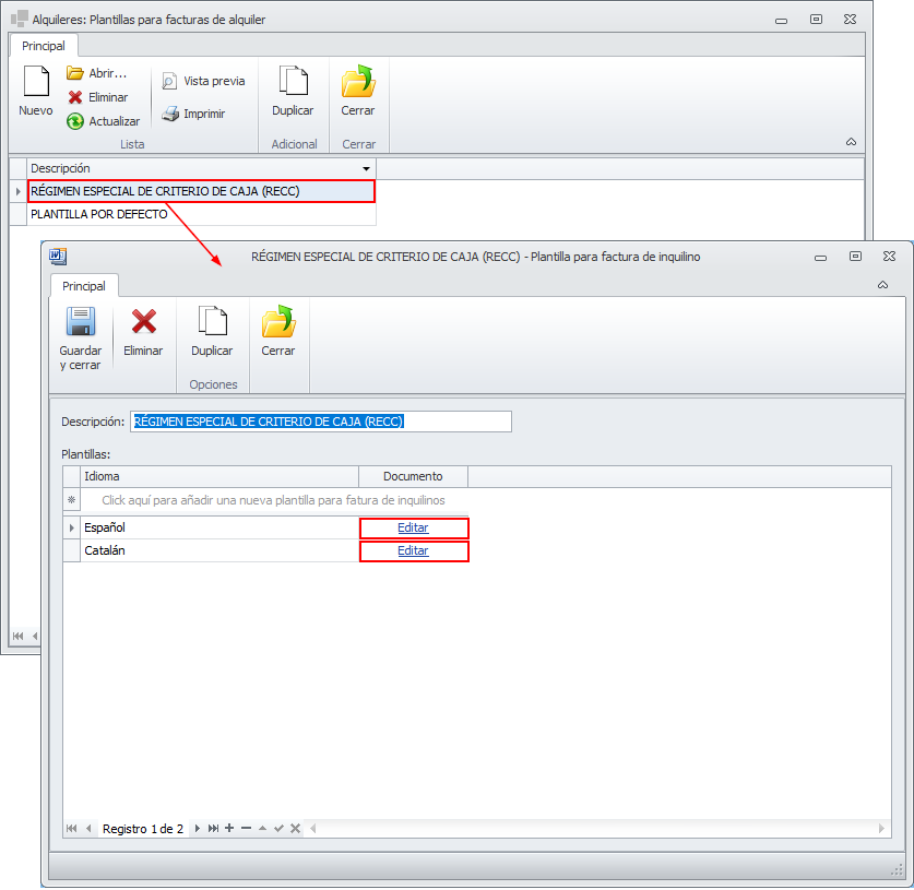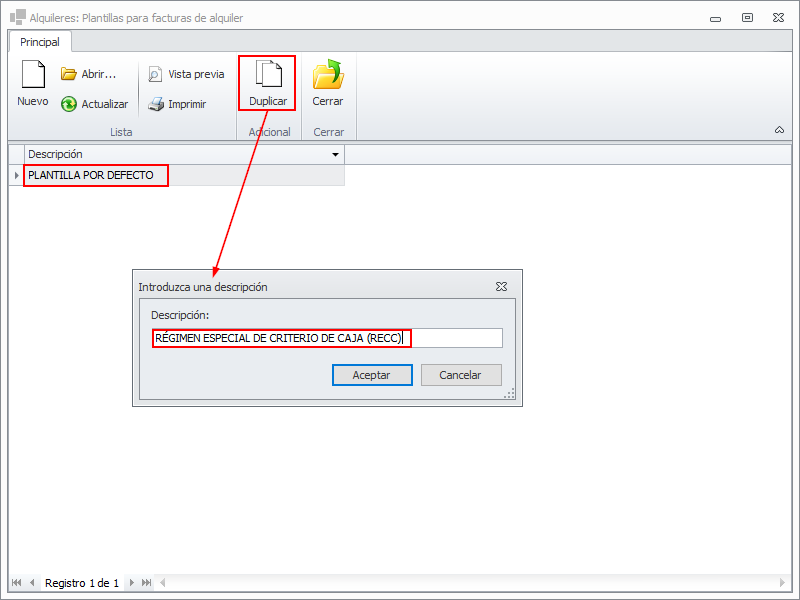 La factura de alquiler de un arrendador adscrito al al Régimen Especial de Criterio de Caja (RECC) debe mostrar claramente un texto indicativo de este hecho. Para imprimir este texto debe crear una plantilla de factura, que puede ser común para todos los arrendadores adscritos al (RECC).