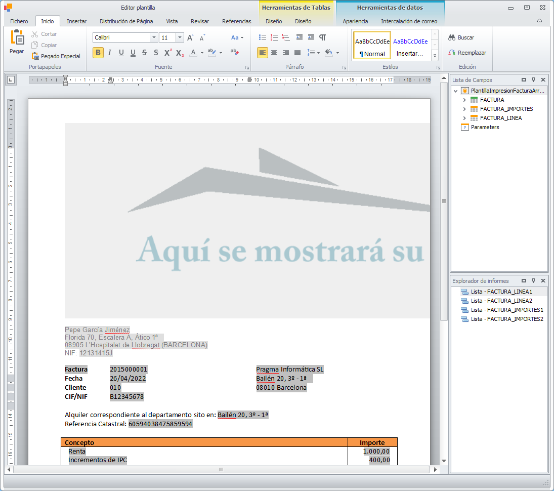 Se abre el editor de la plantilla de la factura. Tendrá un aspecto parecido a éste.