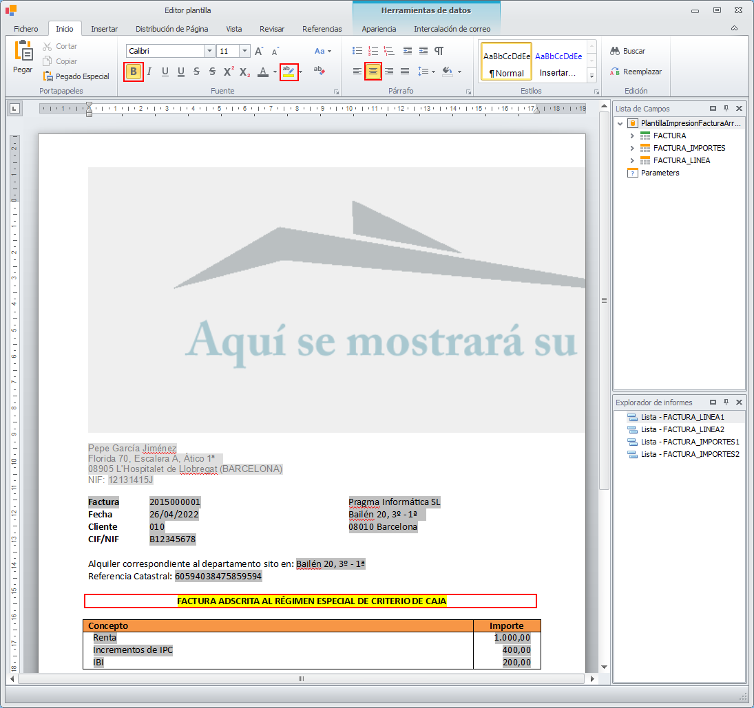 En el siguiente ejemplo se remarcan, en la parte superior, los botones usados para destacar el texto añadido a la factura.