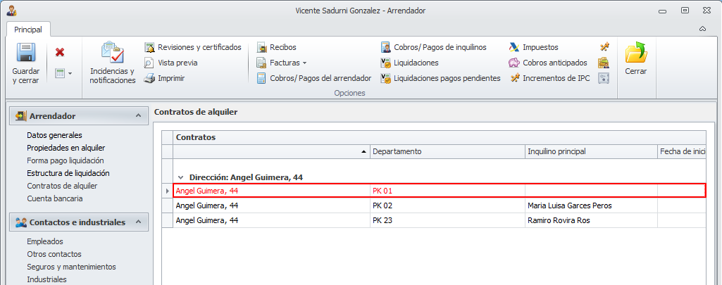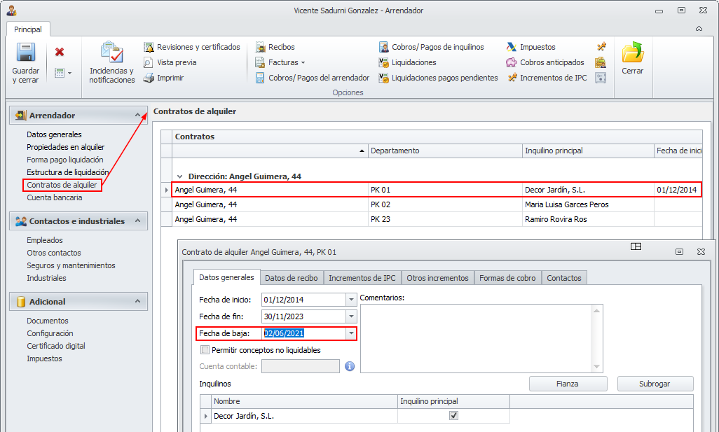 Acceda a la ficha del contrato de alquiler e indique la fecha en que se produce oficialmente la baja.