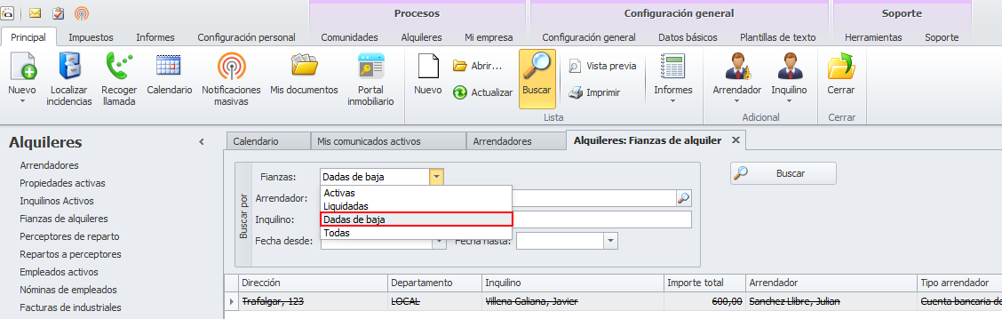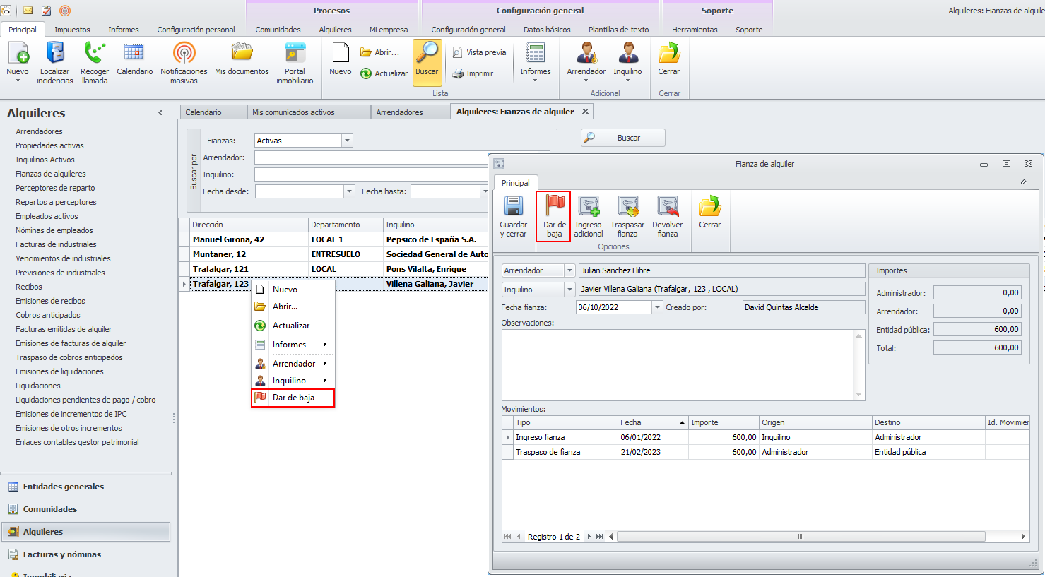 Para dar de baja una fianza, basta con acceder a su ficha y hacer clic en el botón Dar baja. También, desde el menú contextual de la lista de fianzas. Ésta se mantiene con sus importes (en arrendador o entidad pública) pero se oculta en la vista habitual.