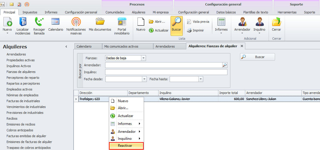 Una fianza dada de baja puede ser reactivada desde el menú contextual de la lista de fianzas, mediante la opción Reactivar.