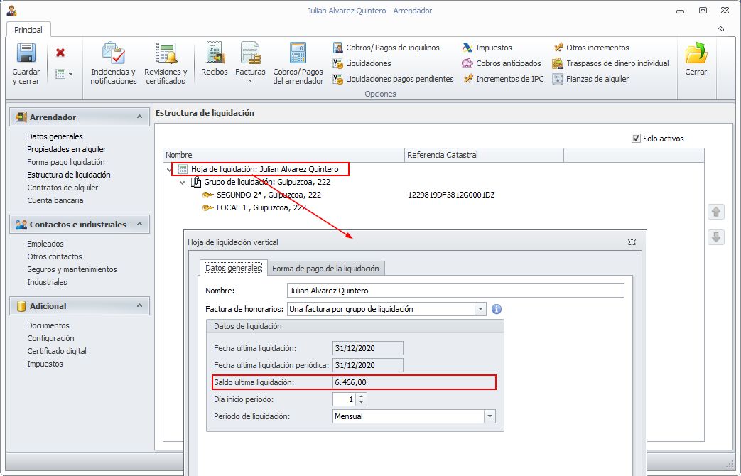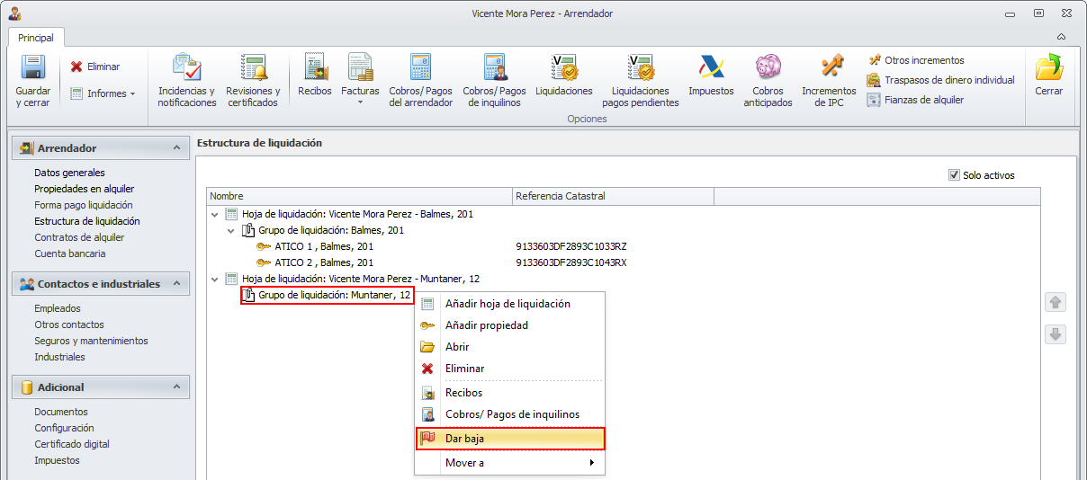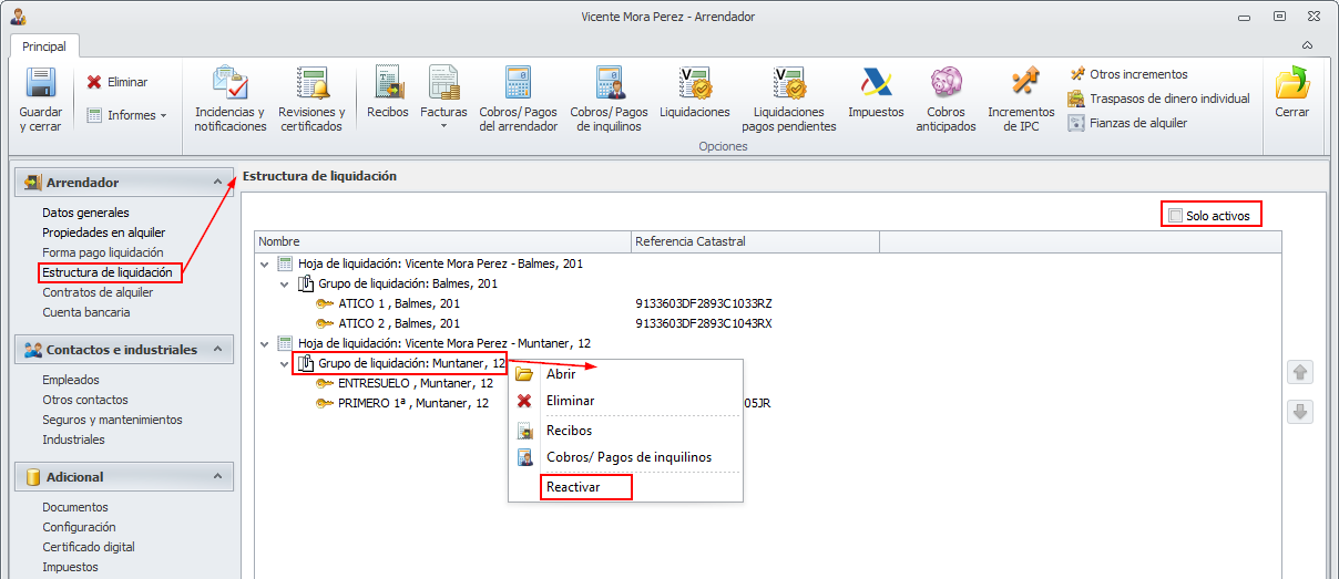 Para reactivar una hoja o grupo de liquidación, debe accederse a la ficha del arrendador. Tras situarse en la sección Estructura de liquidación, debe desactivarse la casilla Sólo activos, para que muestre también las propiedades dadas de baja.