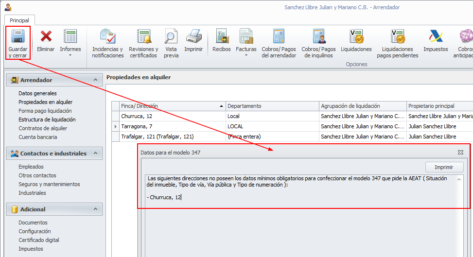 Si se guarda la ficha del arrendador teniendo activada la casilla Generar modelo 347 y sin cumplimentar esos datos, se muestra un error con el texto: “Las siguientes direcciones no poseen los datos mínimos obligatorios para confeccionar el modelo 347 que pide la AEAT…”, como se muestra en la siguiente imagen.