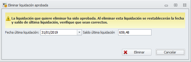 En esta ficha se dispone de un botón Eliminar. Este botón permite eliminar únicamente esa liquidación. Para eliminarla debe cumplir las condiciones relacionadas en la introducción de este mismo documento. Si no se puede eliminar, se mostrará una ventana informando debidamente.