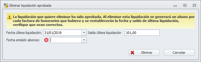 El programa generará un abono por el mismo importe de los honorarios eliminados. La factura de honorarios que se emitió con la liquidación no se eliminará. Ambos documentos se compensarán mutuamente, pero no se podrán eliminar.