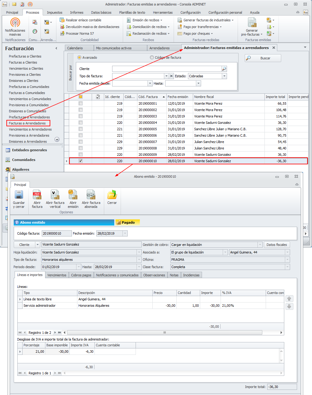 El abono correspondiente a los honorarios de la liquidación se puede consultar en la opción Facturas a arrendadores del apartado Facturación.