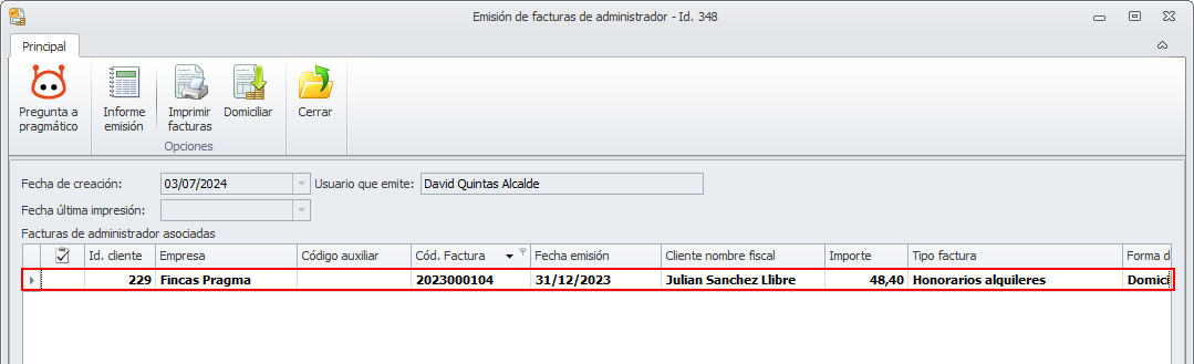 Para asegurarse, sitúese en la lista de facturas emitidas del administrador y compruebe que se trata de las dos últimas.