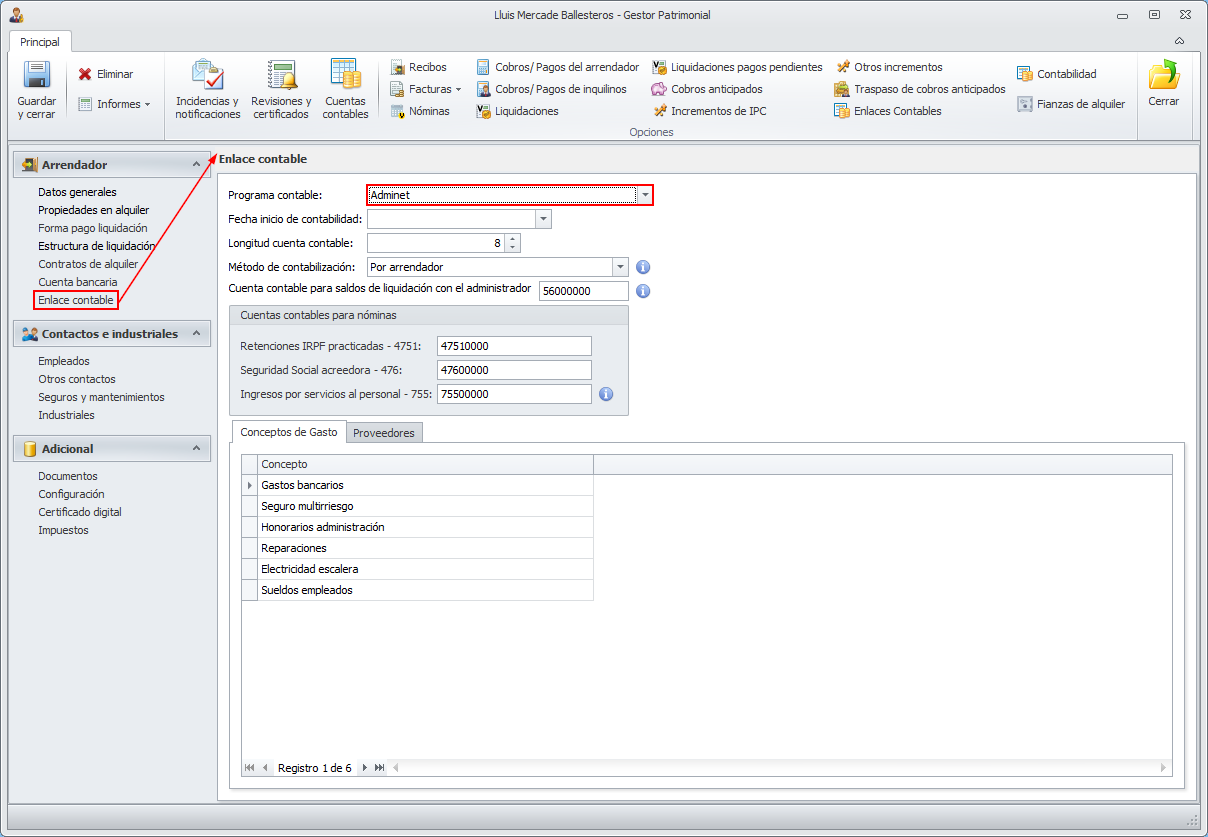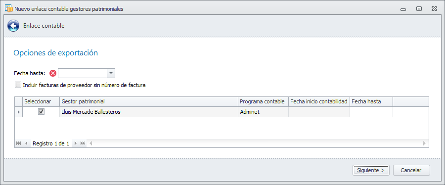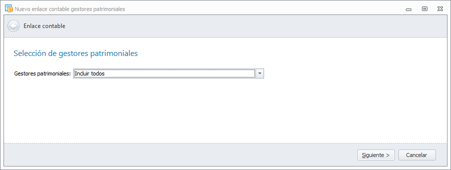 El asistente del enlace contable con Adminet, tiene el siguiente aspecto. En la primera ventana selecciona los gestores patrimoniales a los que quiere generar el enlace.
