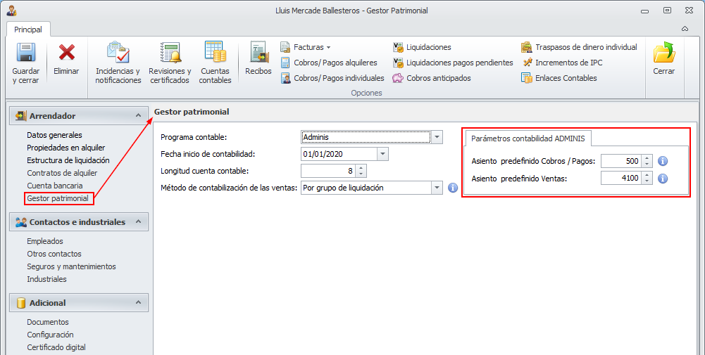 Asiento predefinido Cobros / Pagos: Contabilizará los cobros y devoluciones de recibos registrados en la cuenta del administrador.