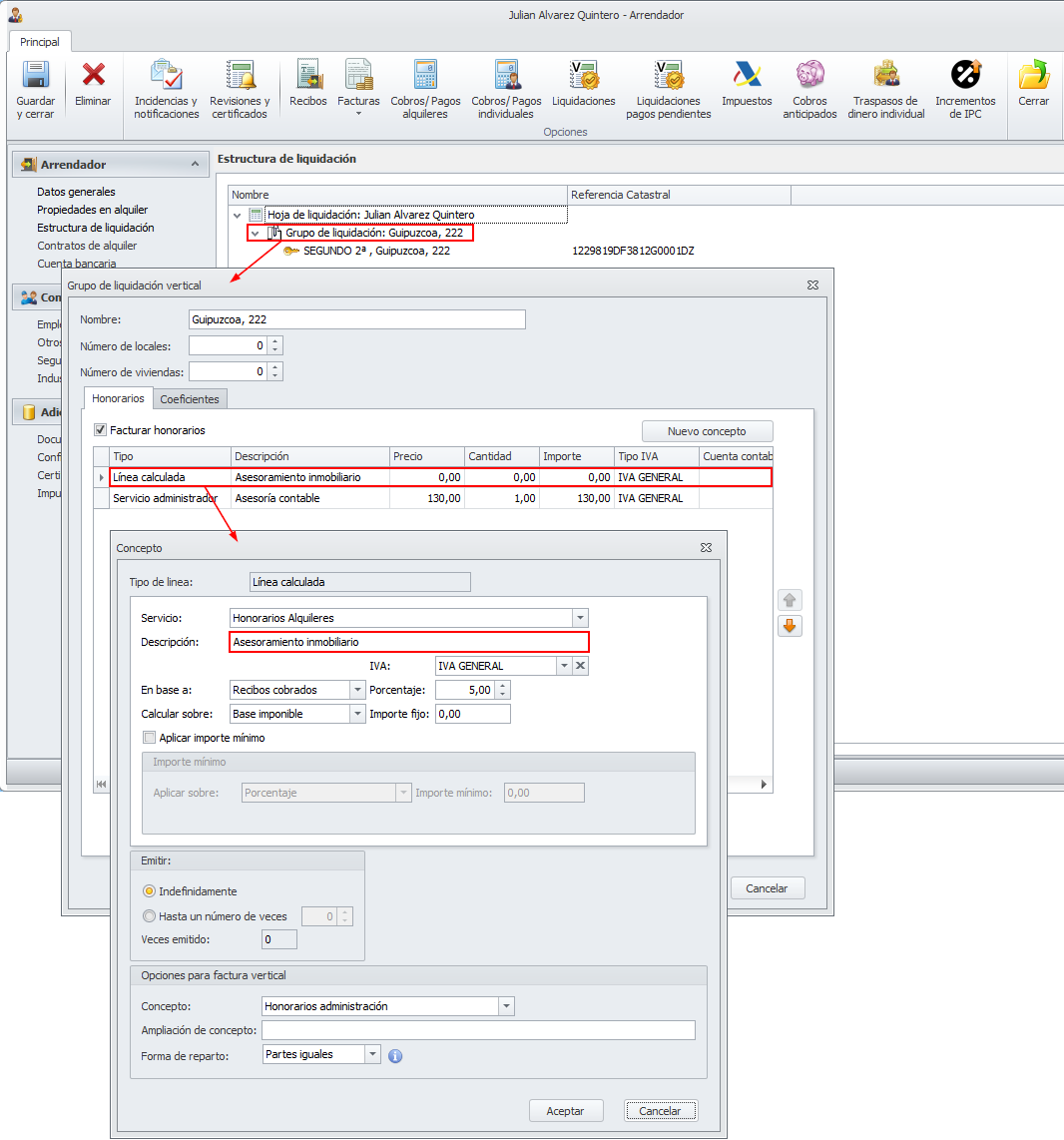 En los grupos de liquidación detallados en la estructura de liquidación, se permite indicar honorarios. Añada una línea calculada, indicando la base de aplicación y el porcentaje a aplicar. Haga clic aquí para ver cómo añadir una línea calculada de honorarios.